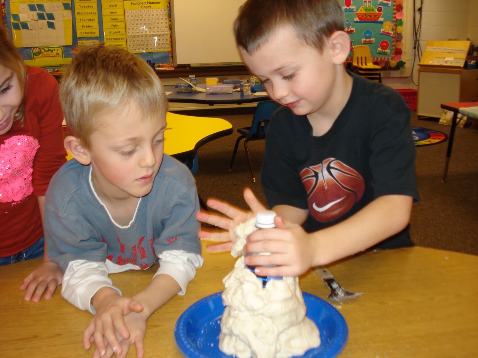 After learning that dinosaurs didn't really go extinct becuase of underwear and it was really the weather and volcano eruptions, Mrs. Erickson's half-day class got to make their own volcano!